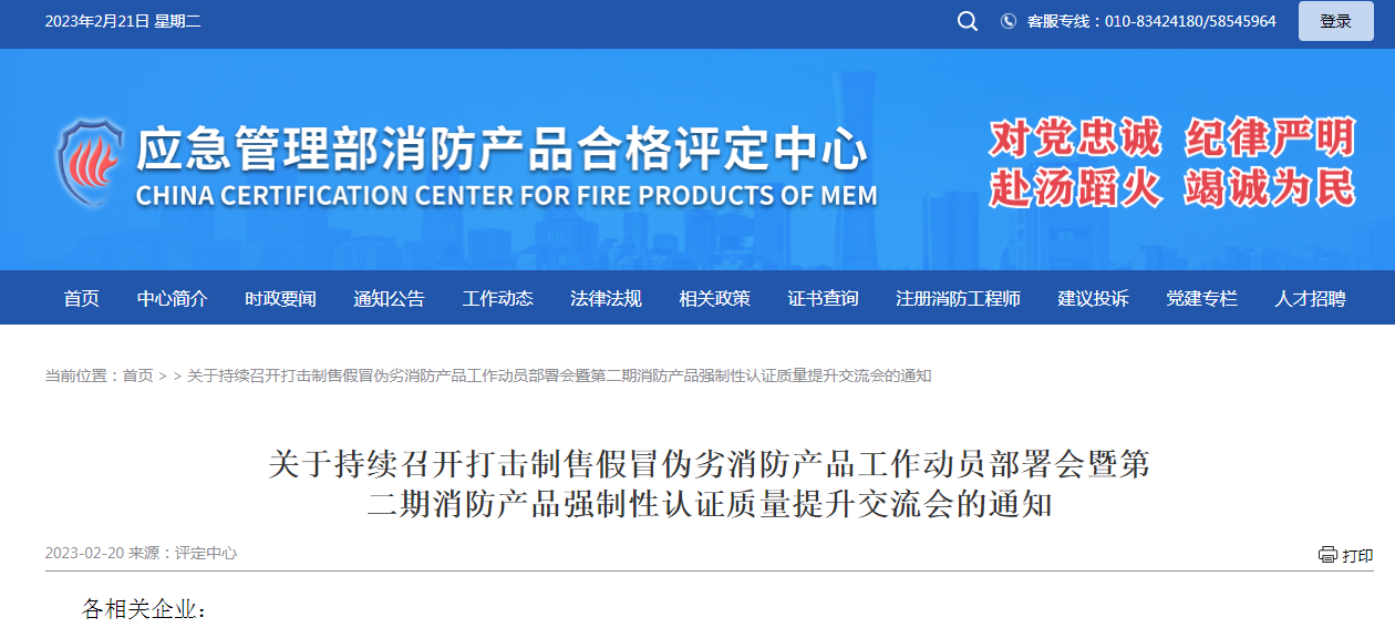 關(guān)于持續(xù)召開打擊制售假冒偽劣消防產(chǎn)品工作動員部署會暨第二期消防產(chǎn)品強制性認證質(zhì)量提升交流會的通知