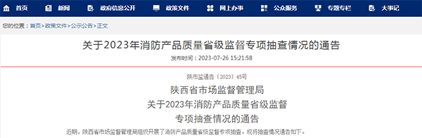 中國(guó)質(zhì)量新聞網(wǎng)訊 2023年7月26日,陜西省市場(chǎng)監(jiān)督管理局網(wǎng)站發(fā)布關(guān)于2023年消防產(chǎn)品質(zhì)量省級(jí)監(jiān)督專項(xiàng)抽查情況的通告。具體抽查情況如下。