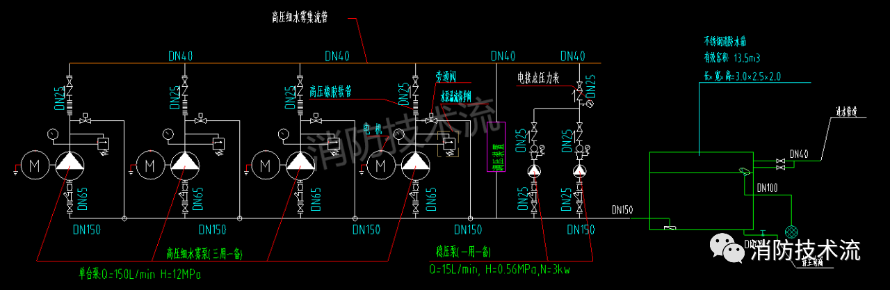 4、采用泵組式高壓細(xì)水霧滅火裝置一套,其中高壓泵3用1備,單臺高壓泵參數(shù)為:Q=150L/min,H=12MPa,N=37kw。在防護區(qū)外就近便于操作的地方設(shè)置分區(qū)控制閥,包括電動閥、控水球閥,壓力開關(guān)、壓力表等,分區(qū)控制閥工作電壓為DC24V。